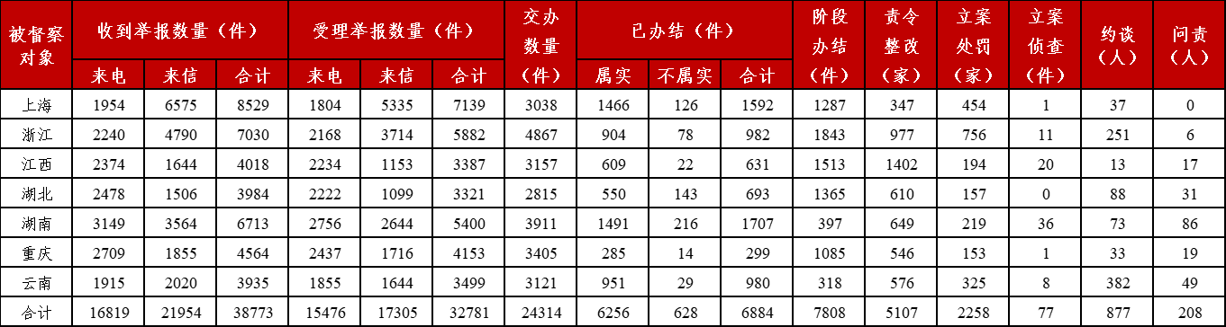 本批环保督察组查实一批突出生态环境问题,曝光典型案例28个。截至2024年6月9日,各督察组共收到群众来电、来信举报38773件,受理有效举报32781件,经梳理合并重复举报,累计向相关省(市)转办24314件。相关省(市)已办结或阶段办结14692件。其中,立案处罚2258家,立案侦查77件;约谈党政领导干部877人,问责党政领导干部208人。