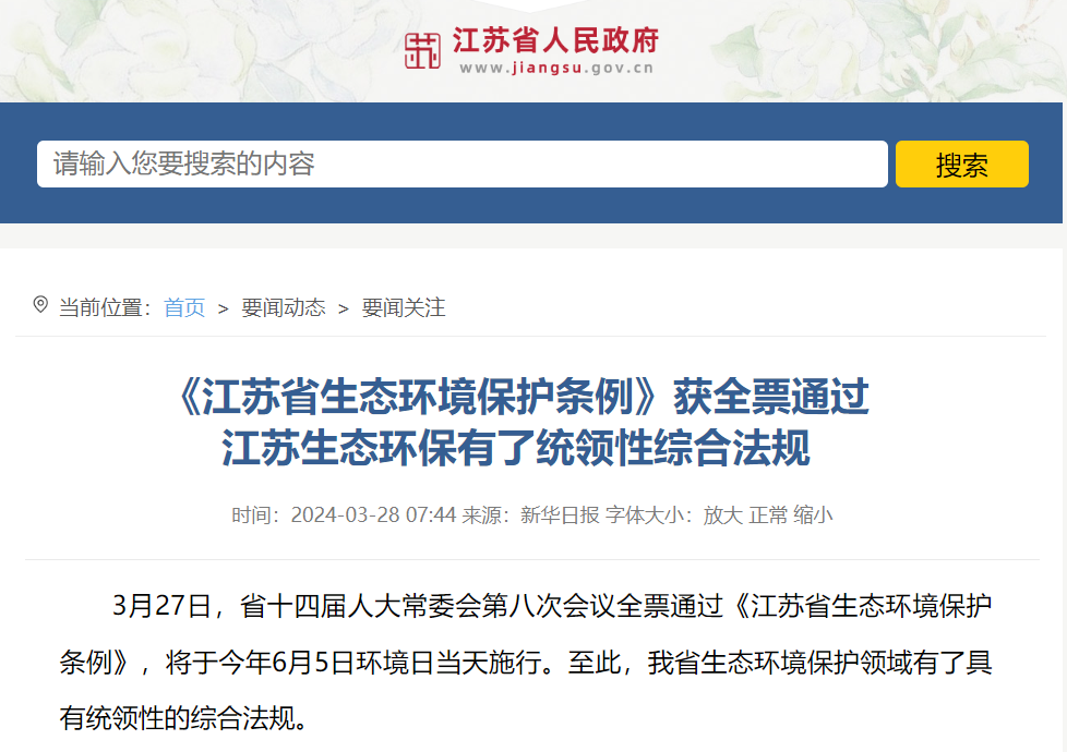 《江苏省生态环境保护条例》已由江苏省十四届人大常委会第八次会议全票通过,将于今年6月5日起施行。